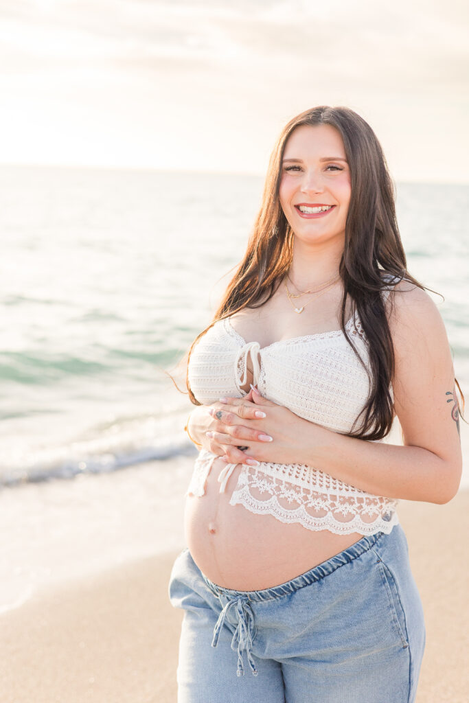 One of the biggest benefits of maternity sessions on the beach is that outfits don’t need to be overly formal to feel special. Texture—like crochet, linen, or soft cotton—adds movement and interest while still feeling natural in the environment.
