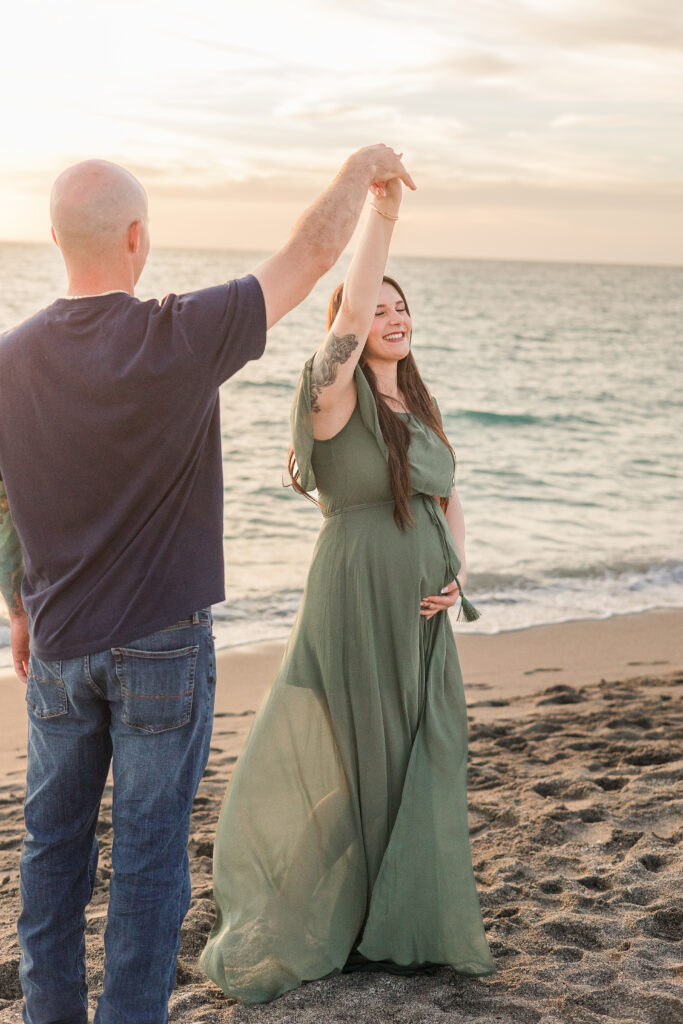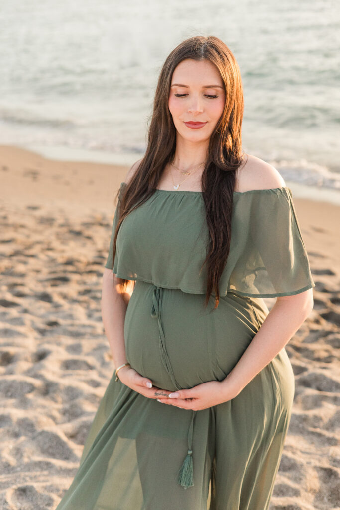 The earthy olive tone paired perfectly with the warm sunset colors reflecting off the water. As the sun dropped lower on the horizon, the dress caught the breeze and created the kind of dreamy, flowing movement that makes sunset beach maternity sessions so magical.